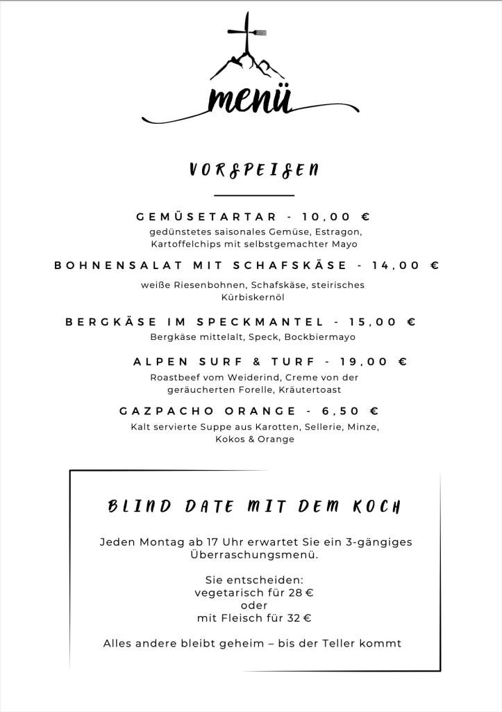Montags erwartet Sie ein drei-gängiges Überraschungsmenü, frisch gekocht und mit viel Liebe zubereitet.